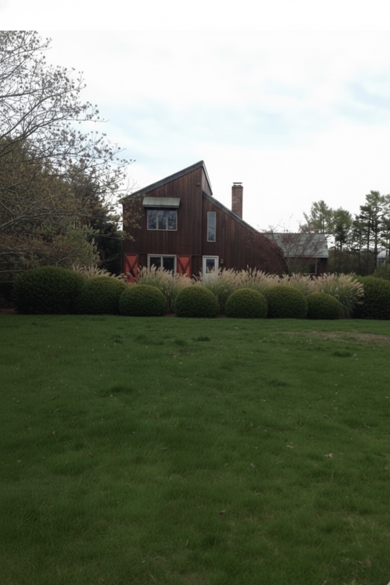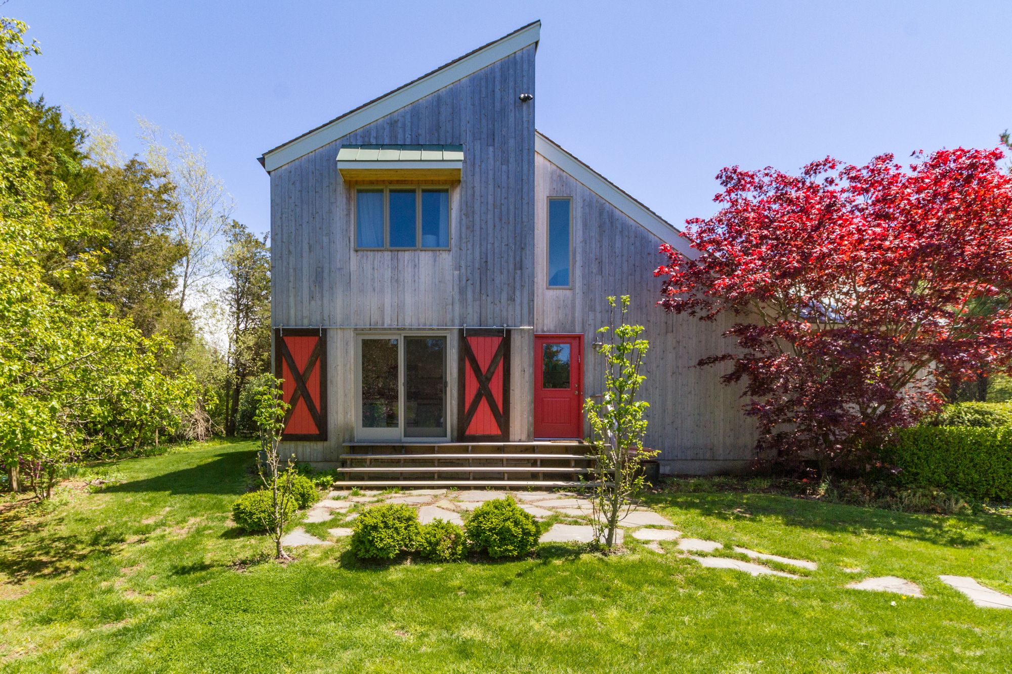 A gut renovation on a modest budget, we transformed a dilapidated Watermill ranch house on a tight budget to an efficient, barn-chic cheerful modern cabin; it melds into its context of glorious potato farmlands with enhanced VSA landscaping design. The home utilizes salvaged cedar wood for new front barn doors; large glass sliding doors to open onto vistas, new steel cables and wide cedar deck, copper and wood roof. We eliminated an awkward 80s bay windows for a streamlined look that resonates with adjacent farmland. The boldly colored sliding doors serve as protective shudders and open onto a breakfast terrace with landscaped path to a pavilion and gravel drive. The pavilion, added years after the renovation, was likened by the New York Times to the work of Phillip Johnson in the article, Pavilions are the Space Between Art and Architecture, 2021.